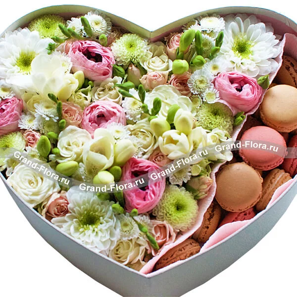 Стандартный (на фото): хризантема белая - 1 шт., хризантема белая (сантини) - 2 шт., фрезия белая - 4 шт., рунункулюс розовый - 5 шт., роза кустовая розовая - 1 шт., оазис, макарунс - 15 шт., коробка большая в виде сердца (30х30см).