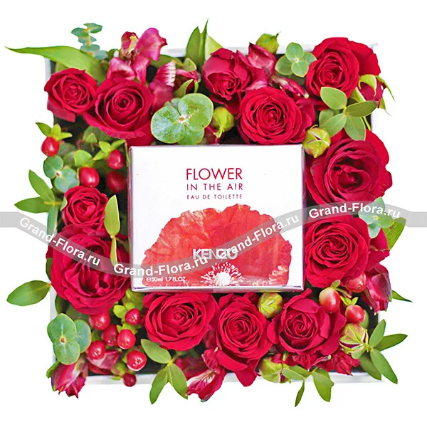 Стандартный: роза красная - 6 шт., роза кустовая красная - 2 шт., альстромерия красная - 1 шт., гиперикум, эвкалипт, парфюм KENZO "Flower in the air 30 ml., оазис, коробка.